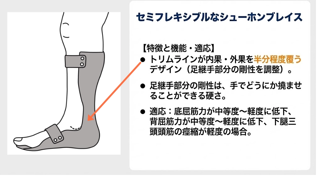 • セミフレキシブル以上の剛性を持つシューホンブレイス(底屈制限を再現するため): プラスチックが内果・外果を半分程度覆っており、足継手部分の剛性が高いデザインのシューホンブレイスを使用してください。