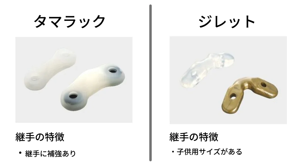 タマラックとジレットの大きな違いは、補強があるかないか。子供用サイズがあるかないか。機能に大きな差はない。
